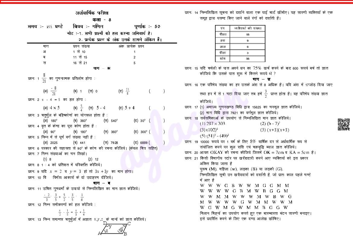 Practicing with the RBSE Class 8th Maths Half Yearly Paper 2025-26 ensures that you get familiar with the exam structure. It provides valuable insights into the type of questions and marks distribution used in the Class 8 Maths half yearly exam question paper, helping students to prepare more strategically. The Rajasthan Board 8th Class Half-Yearly Exam Question Paper of Maths is as follows. You can also use this as a RBSE class 8th class Model Question Paper.