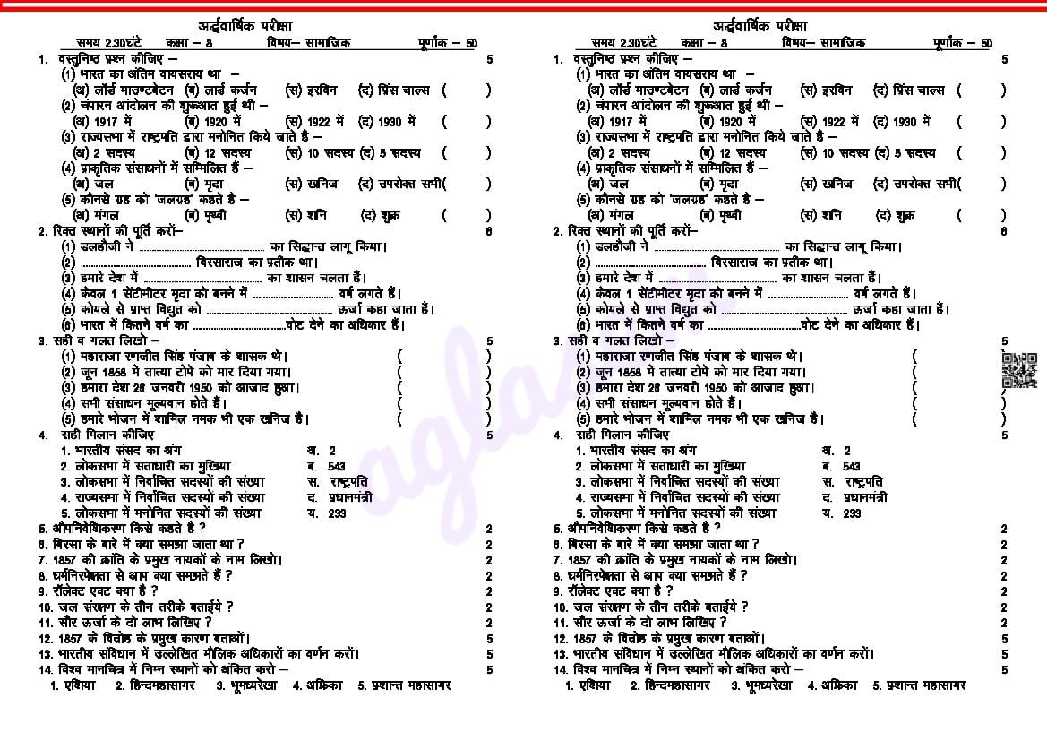 | Study Material Here | RBSE Class 8 Social Science Half Yearly Question Paper 2025 |
