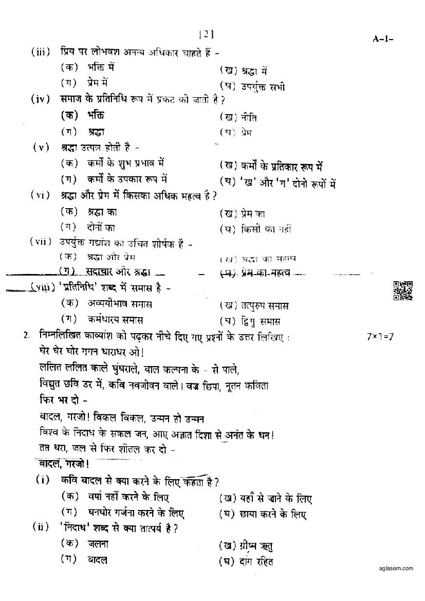 The Rajasthan Board previous year question paper for class 9 Hindi A is as follows.
