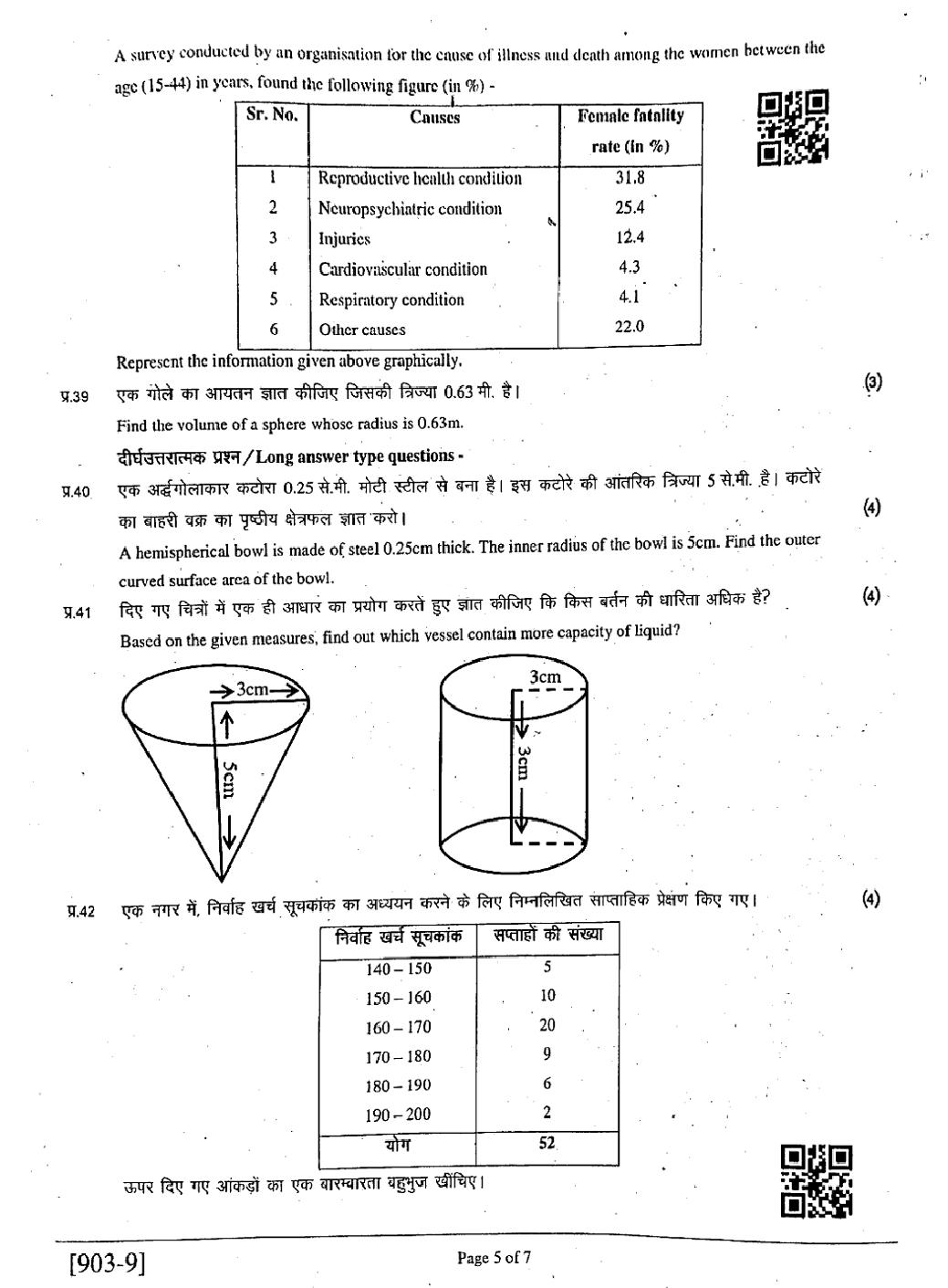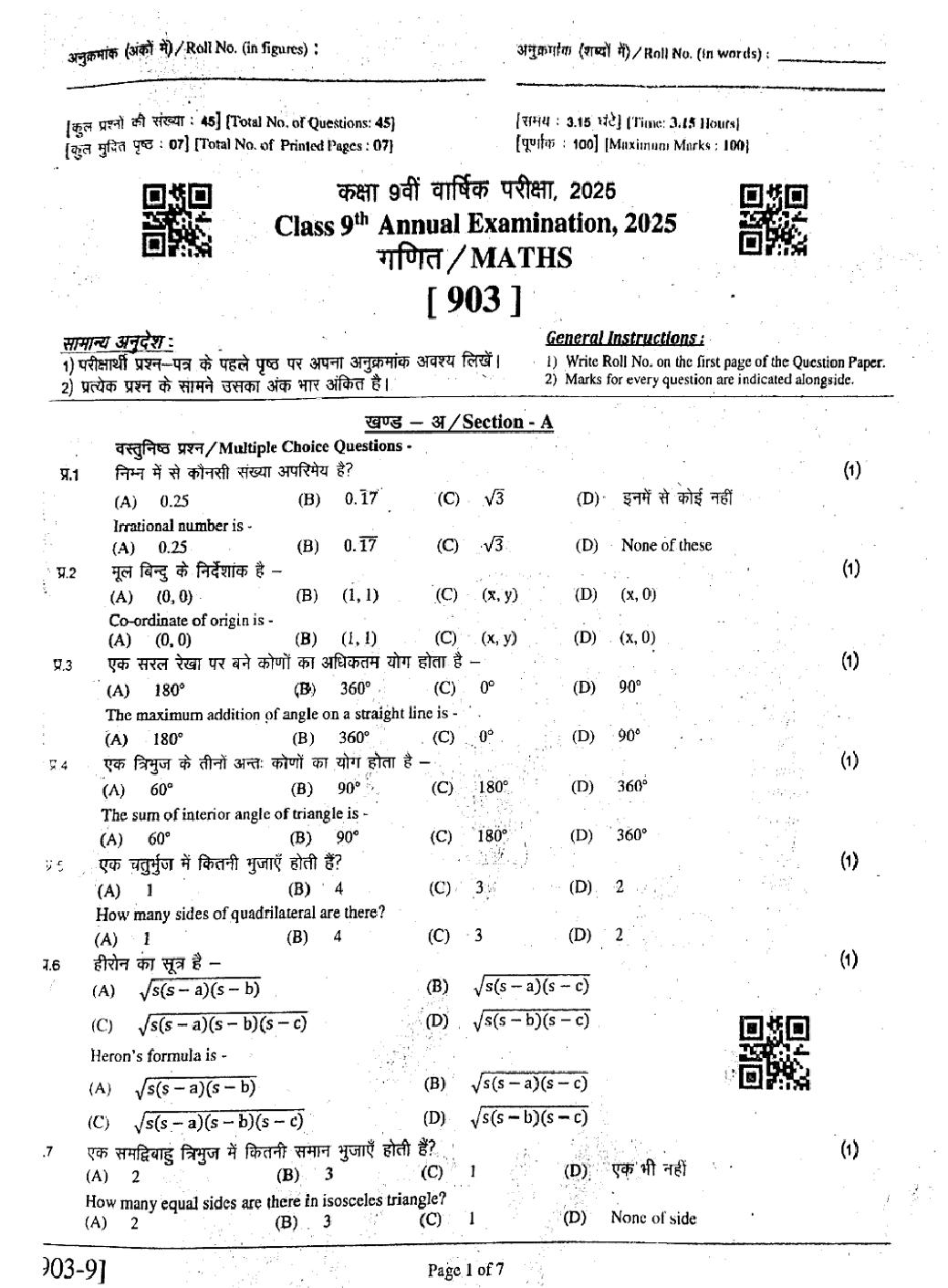 RBSE 9th Maths Question Paper 2025 PDF is given below.
