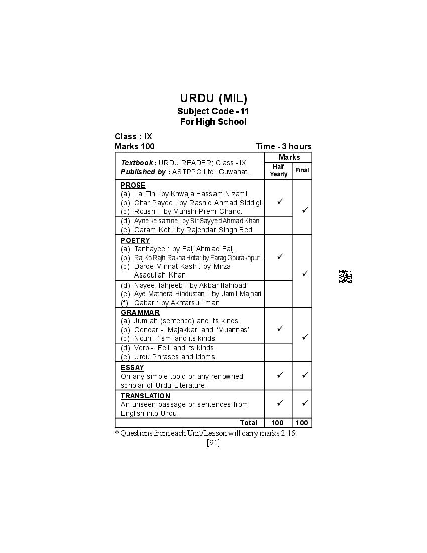 | Resource Here | SEBA 9th Syllabus for Urdu |