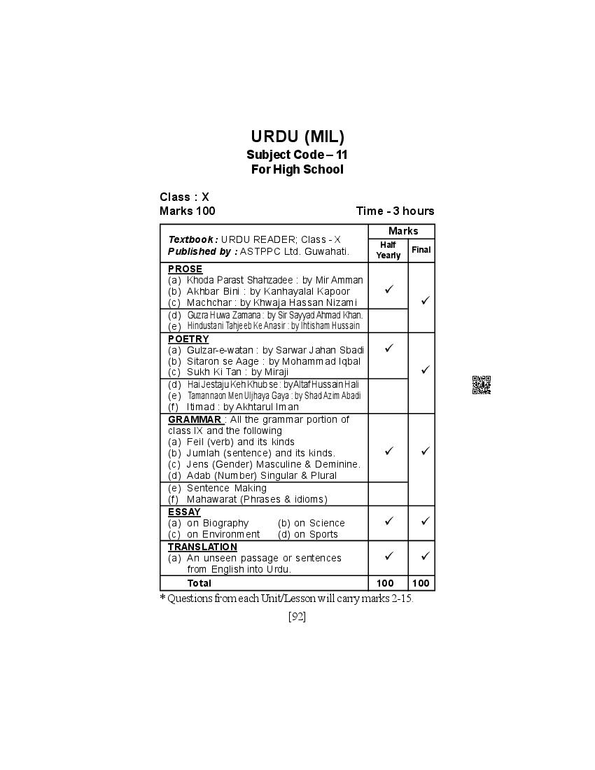 SEBA Class 9th & Class 10th Syllabus 2026 Urdu View Download