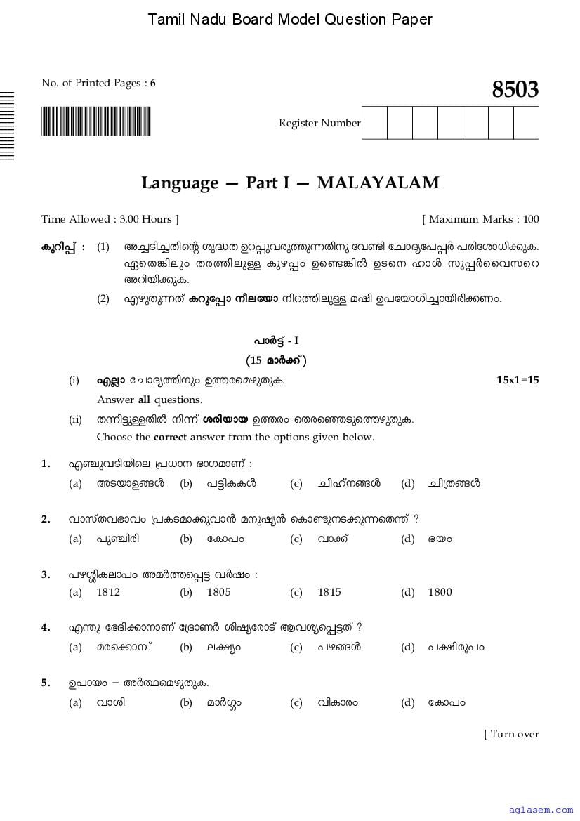 | Study Material Here | Tamil Nadu Board Model Question Paper for Class 10 Malayalam |