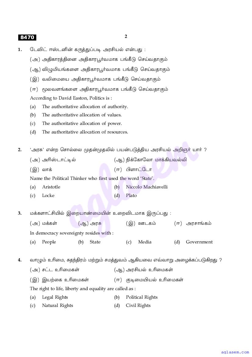 தமிழ்நாடு போர்டு வகுப்பு 11 Political Science மாதிரி வினாத்தாள் 2026 உங்கள் 11 ஆம் வகுப்பு போர்டு தேர்வுகளுக்குத் தயாராவதற்கு உதவும் வகையில் வெளியிடப்பட்டுள்ளது. நீங்கள் இப்போது HSC (+1) Political Science மாதிரி பேப்பர் PDF ஐ இங்கிருந்து aglasem.com இல் பதிவிறக்கம் செய்யலாம். 11 ஆம் வகுப்பின் சமீபத்திய DGE TN பாடத்திட்டத்தின்படி மாதிரித் தாளில் மாதிரி கேள்விகள் உள்ளன Political Science. எனவே நீங்கள் இந்த வினாத்தாளைத் தீர்த்தால், 11 ஆம் வகுப்பு Political Science தேர்வில் 100% மதிப்பெண்கள் பெறுவதற்கான வாய்ப்புகளை மேம்படுத்துகிறது.