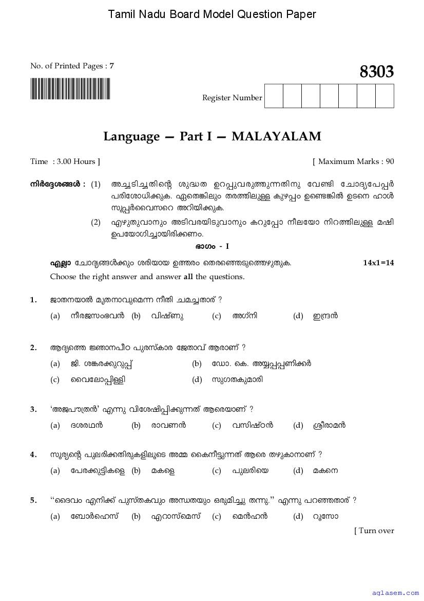 Tamil Nadu 12th Std Model Question Paper 2026 Malayalam View Download