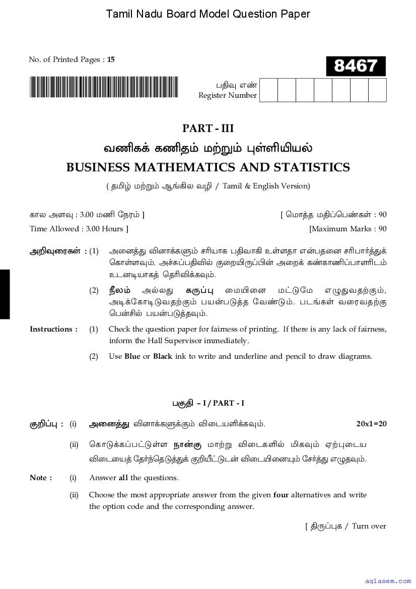 Tamil Nadu 11th Std Model Question Paper 2026 Business Mathematics & Statistics View Download