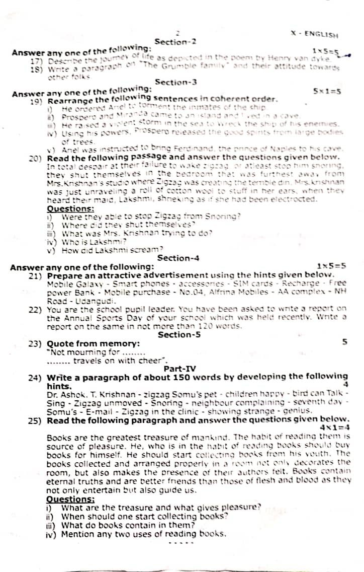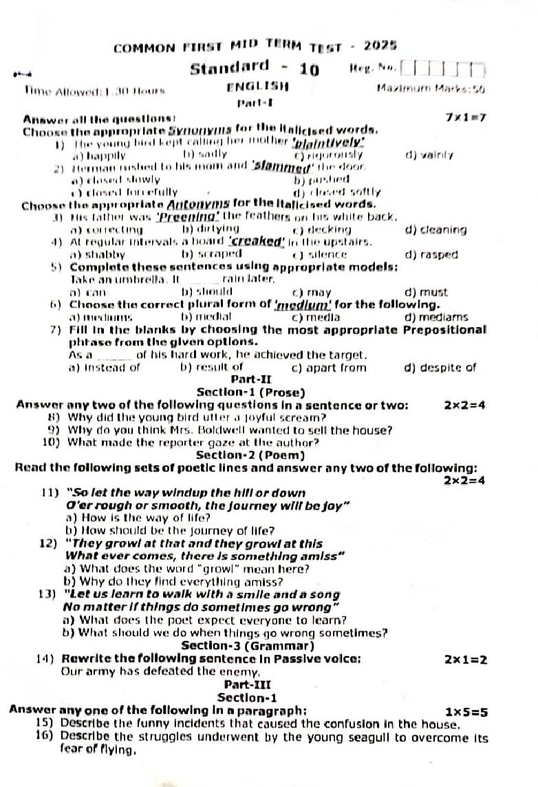 The question paper of Tamil Nadu state First mid term examinations of standard 10th for English subject is as follows.