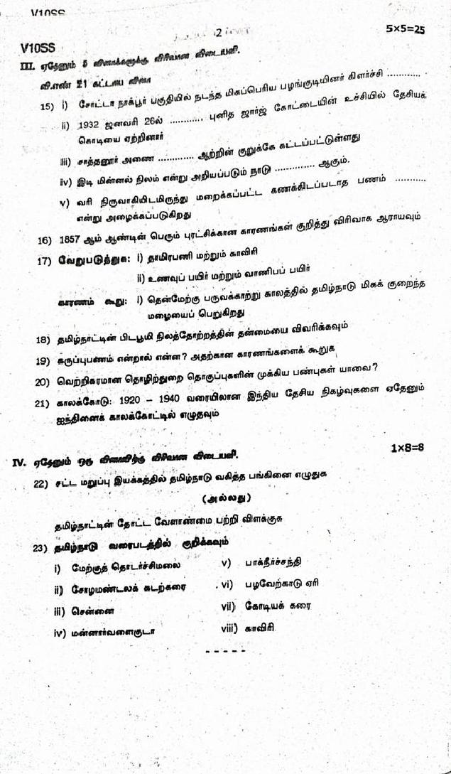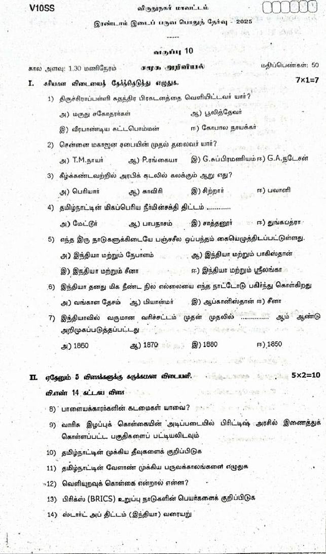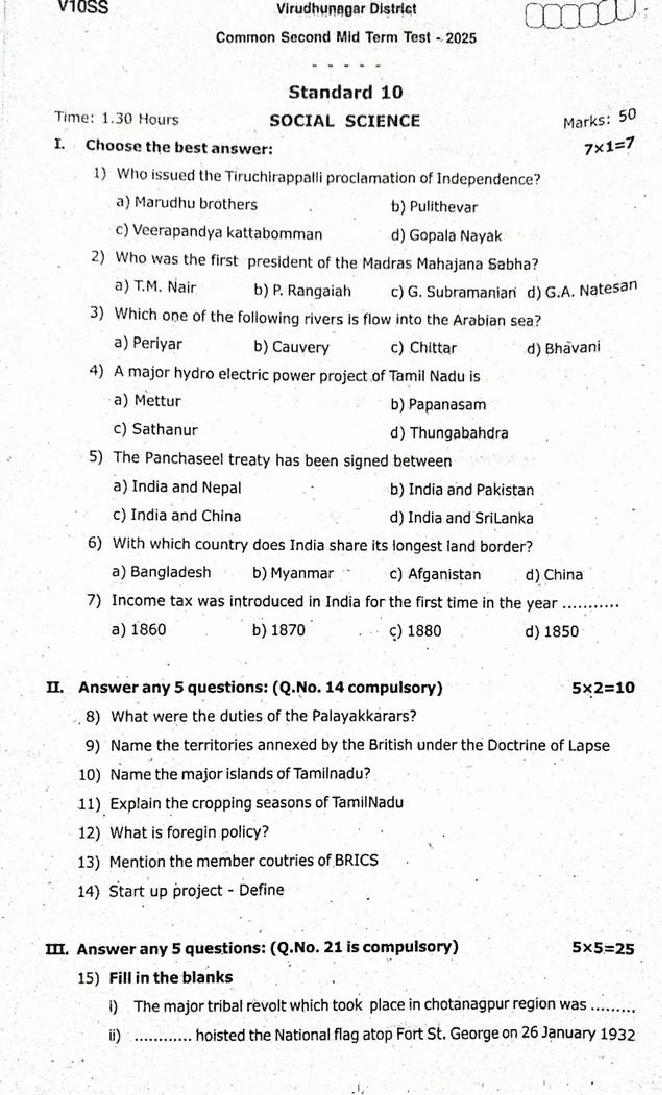The question paper of Tamil Nadu state Second mid term examinations 2025-26 of standard 10th for Social Science subject is as follows.
