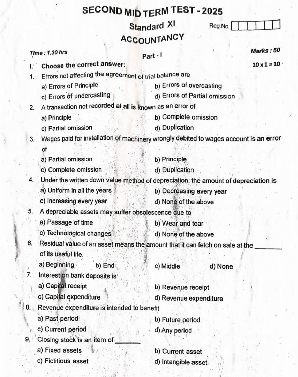 The question paper of Tamil Nadu state Second mid term examinations 2025-26 of standard 11th for Accountancy subject is as follows.