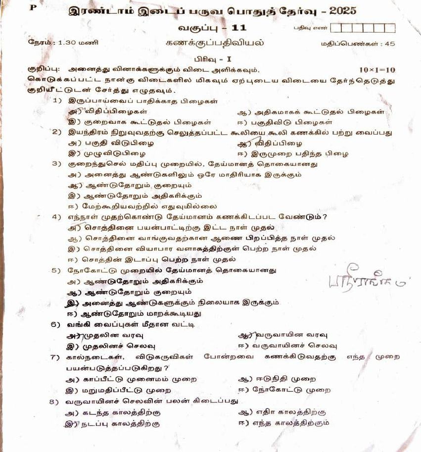 TN 11th Accountancy Second Mid Term Question Paper 2025 PDF Download Link – Click Here to Download Question Paper PDF