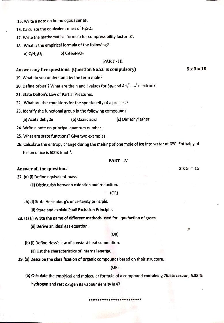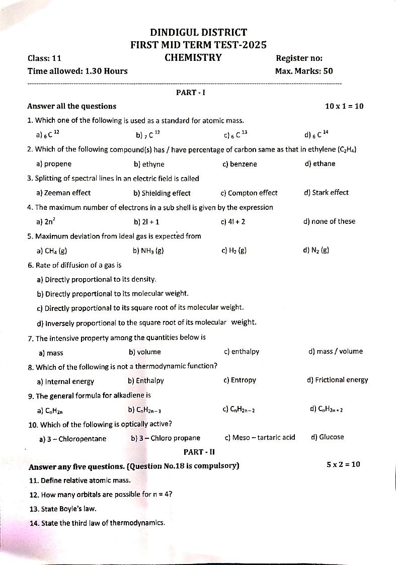 The question paper of Tamil Nadu state First mid term examinations 2025-26 of standard 11th for Chemistry subject is as follows.