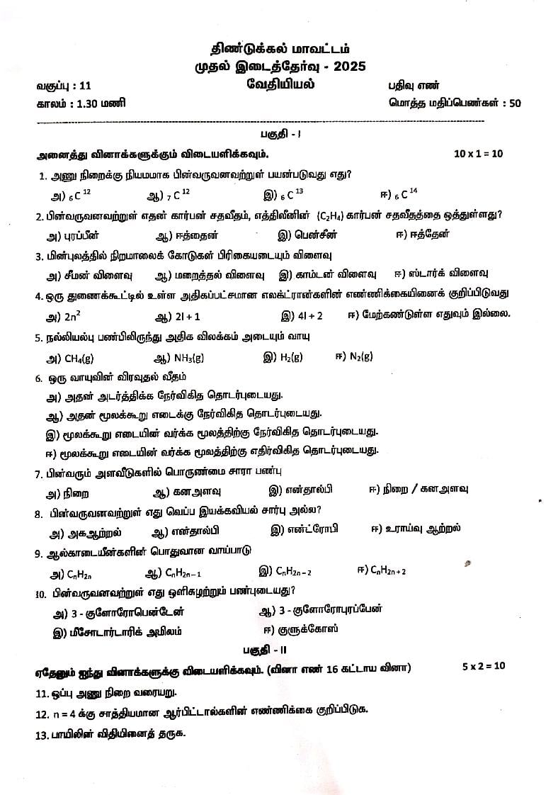 TN Class 11 First Mid Term Question Paper 2025 Chemistry View Download