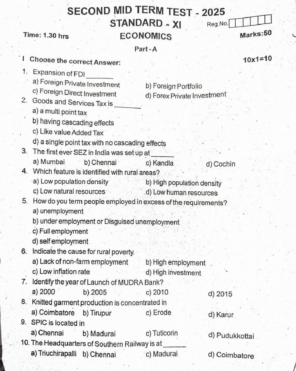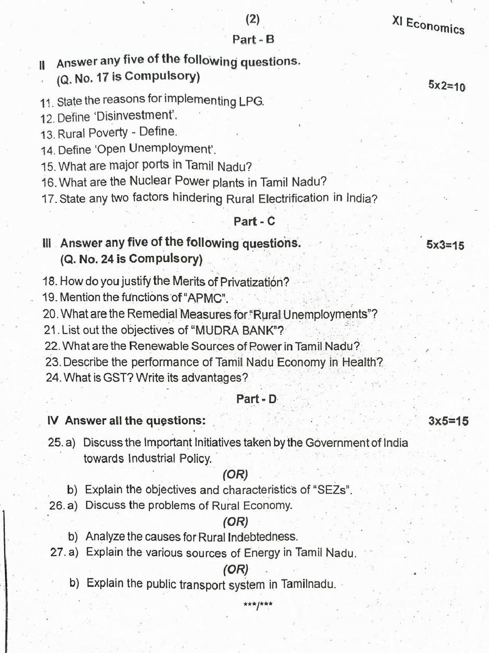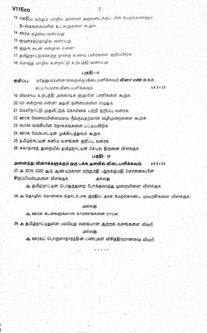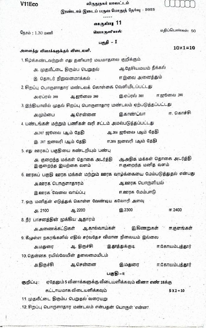 The question paper of Tamil Nadu state Second mid term examinations 2025-26 of standard 11th for Economics subject is as follows.