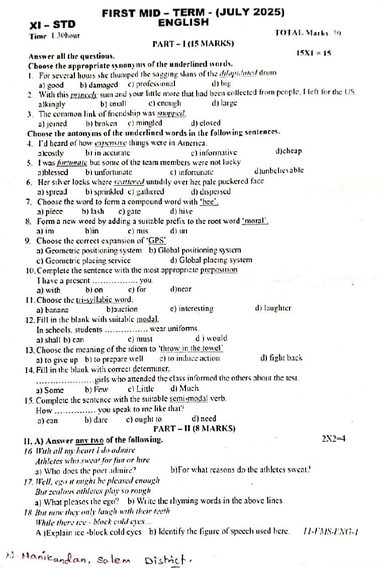 11th Standard English Mid-Term Exam