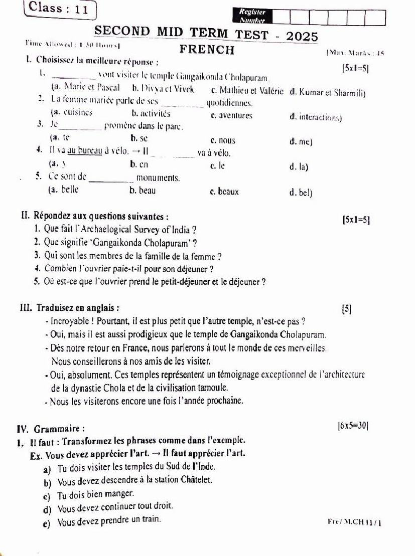 The question paper of Tamil Nadu state Second mid term examinations 2025-26 of standard 11th for French subject is as follows.