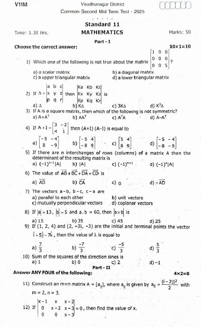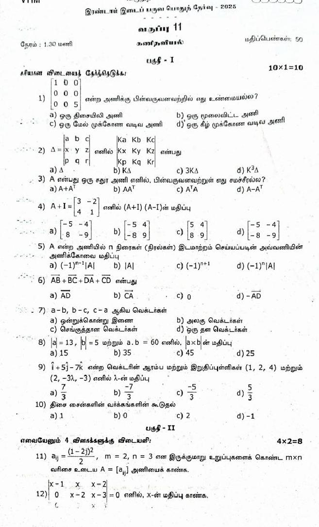 The question paper of Tamil Nadu state Second mid term examinations 2025-26 of standard 11th for Maths subject is as follows.
