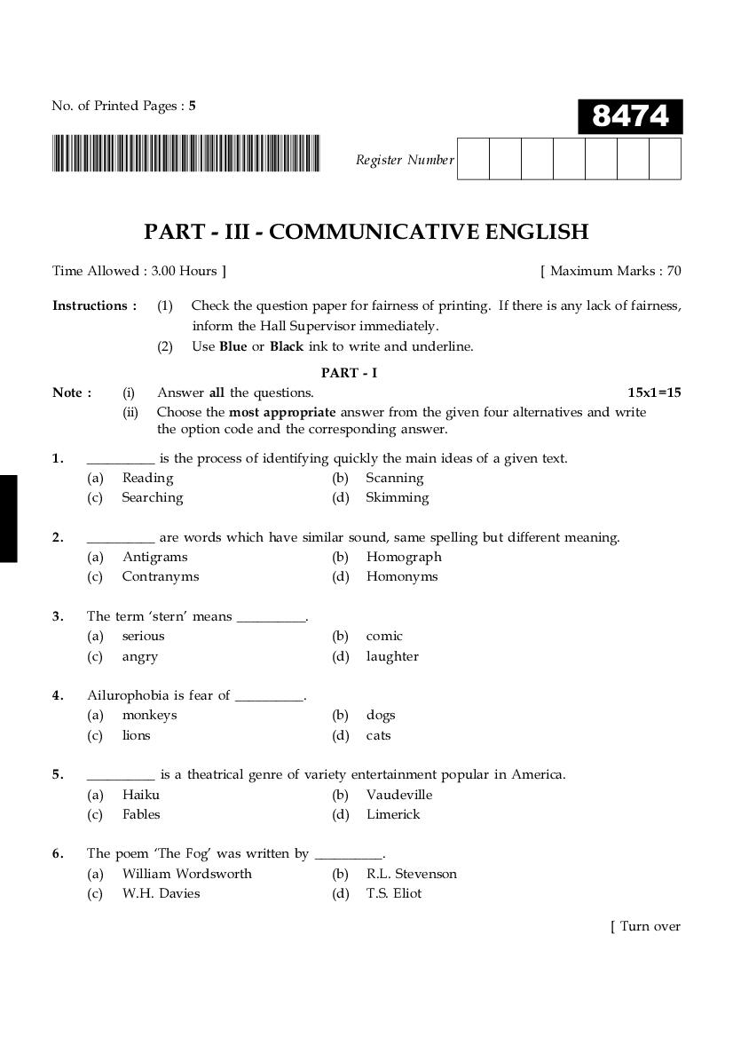 While you can easily download the TN 11th English Communicative previous year question paper from link above. Similarly you can study the complete English Communicative question paper here also. The entire HSE (+1) question paper is as follows.