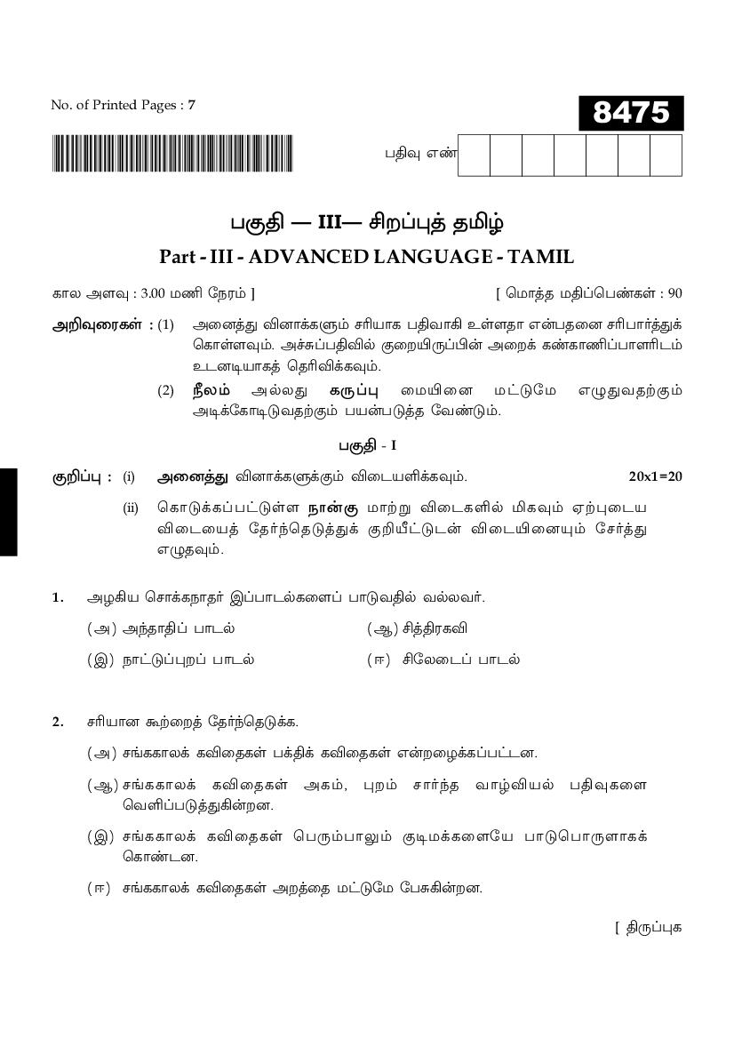 The TN Board Previous Year Question Paper for HSE (+1) (Class 11) Tamil Advanced is as follows.