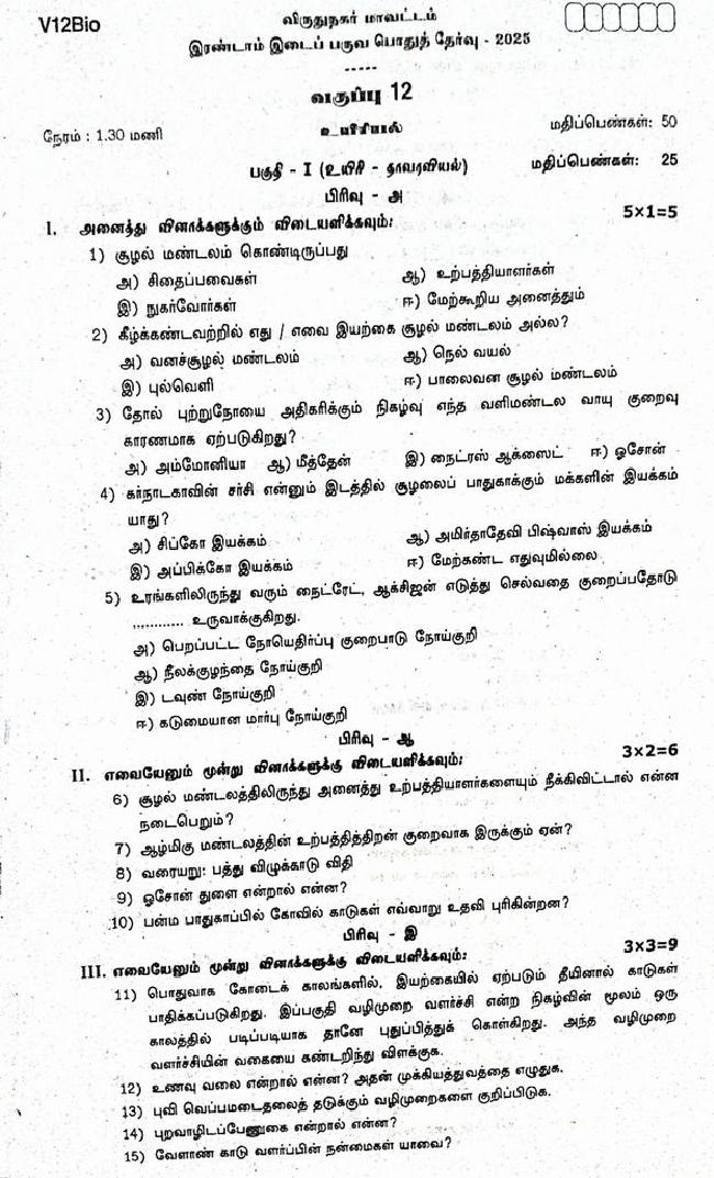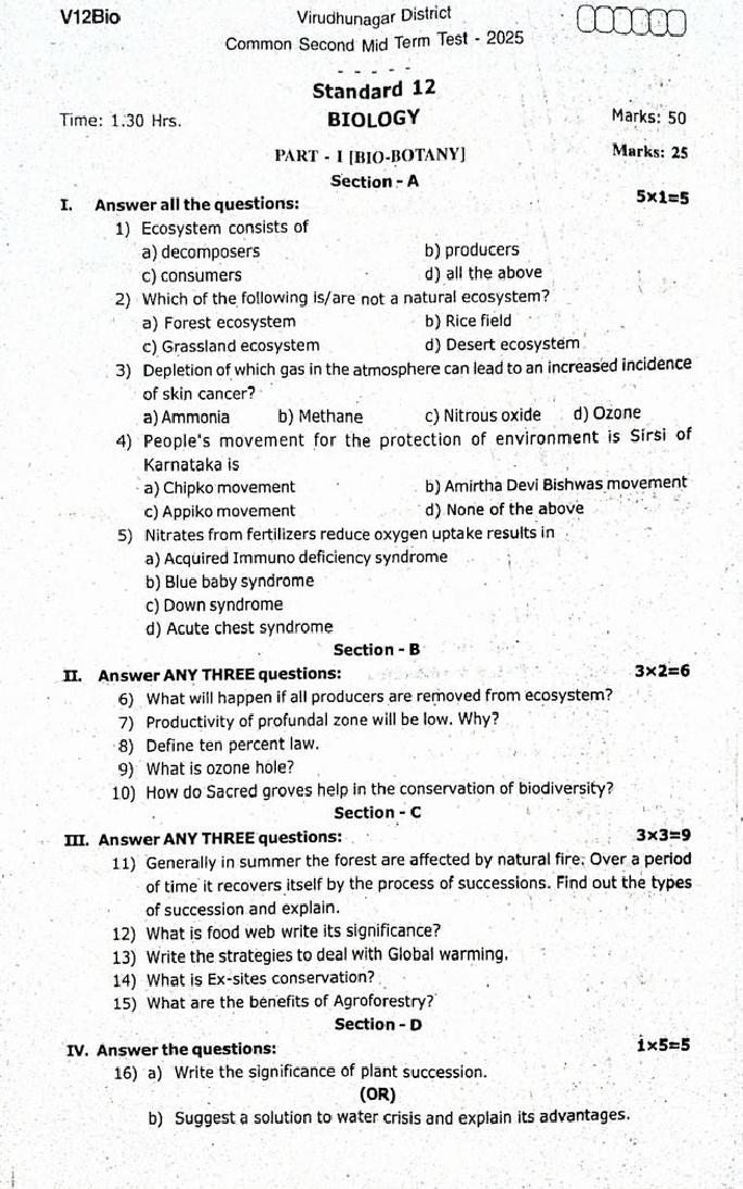 The question paper of Tamil Nadu state Second mid term examinations 2025-26 of standard 12th for Biology subject is as follows.