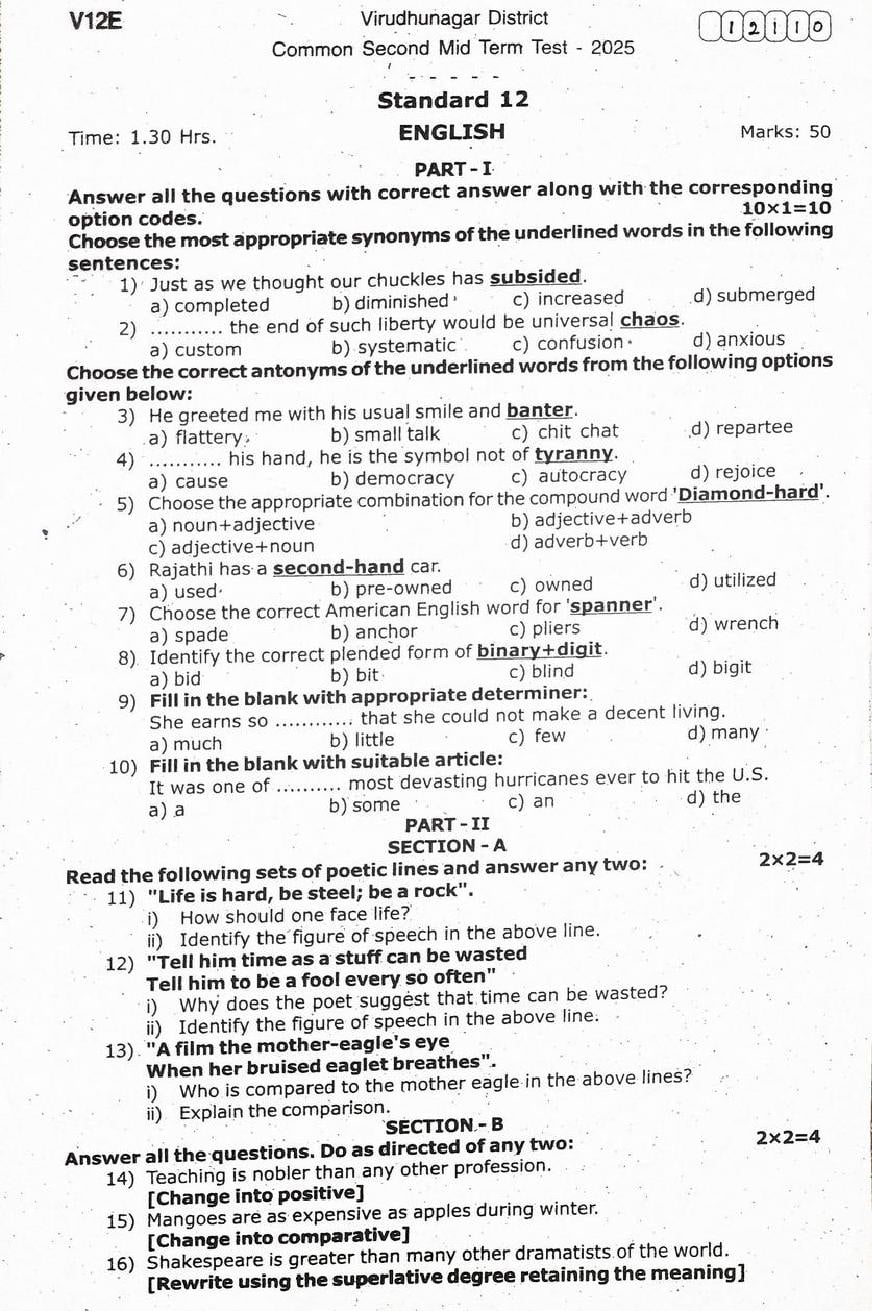 The question paper of Tamil Nadu state Second mid term examinations 2025-26 of standard 12th for English subject is as follows.