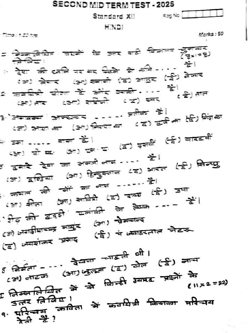 The question paper of Tamil Nadu state Second mid term examinations 2025-26 of standard 12th for Hindi subject is as follows.