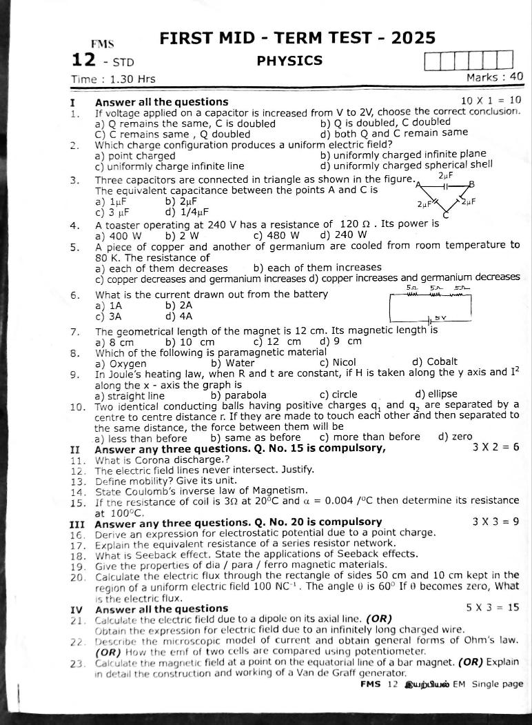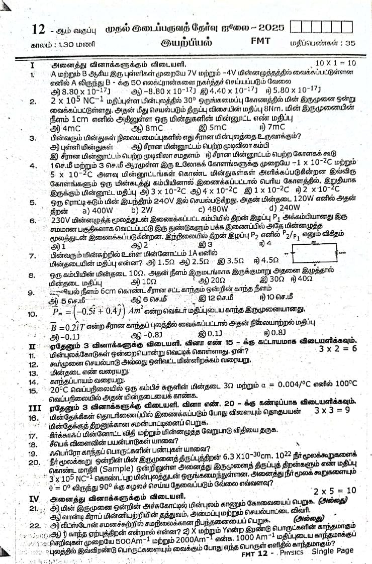 TN Class 12 First Mid Term Question Paper 2025 Physics View Download