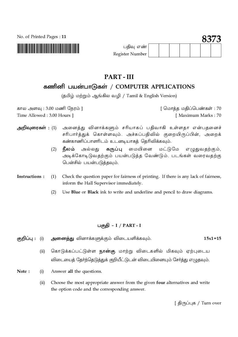 TN 12th Question Paper 2025 Computer Applications View Download