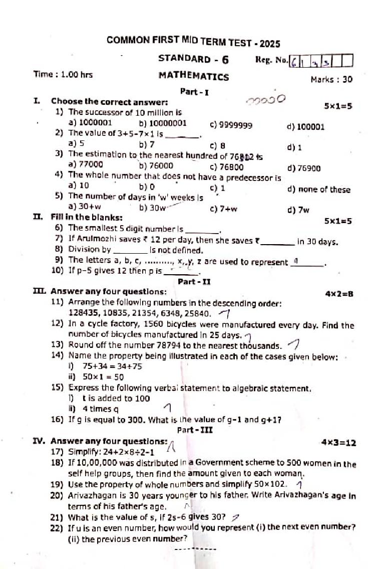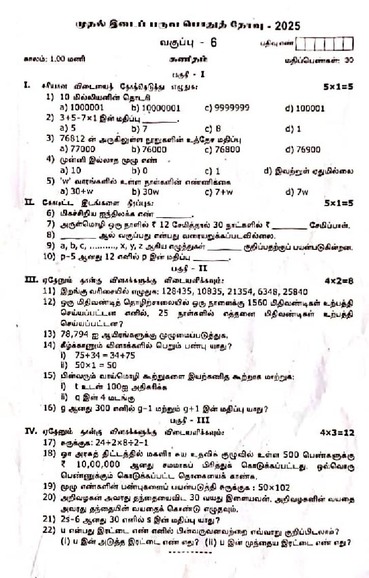 The question paper of Tamil Nadu state First mid term examinations 2025-26 of standard 6th for Maths subject is as follows.