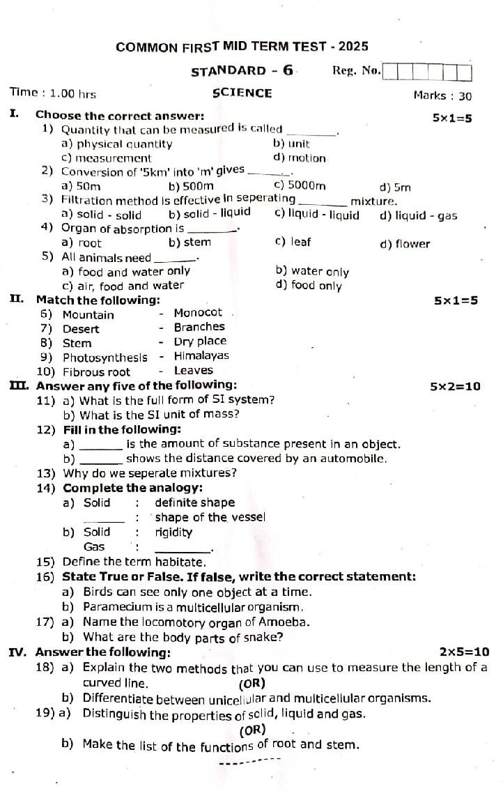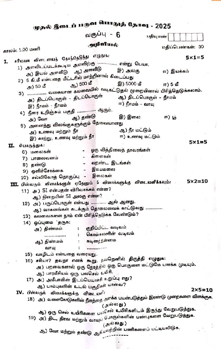The question paper of Tamil Nadu state First mid term examinations 2025-26 of standard 6th for Science subject is as follows.