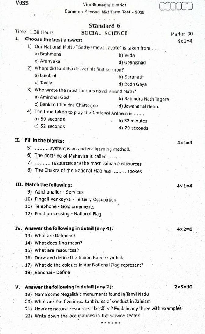 The question paper of Tamil Nadu state Second mid term examinations 2025-26 of standard 6th for Social Science subject is as follows.