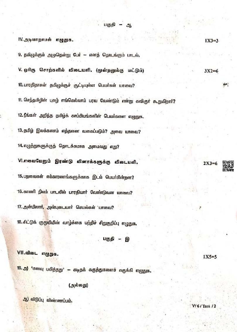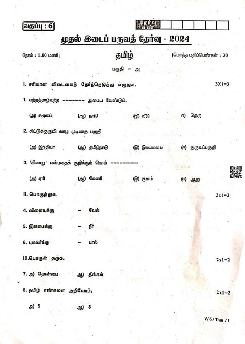 TN Class 6 First Mid Term Question Paper 2024 Tamil View Download