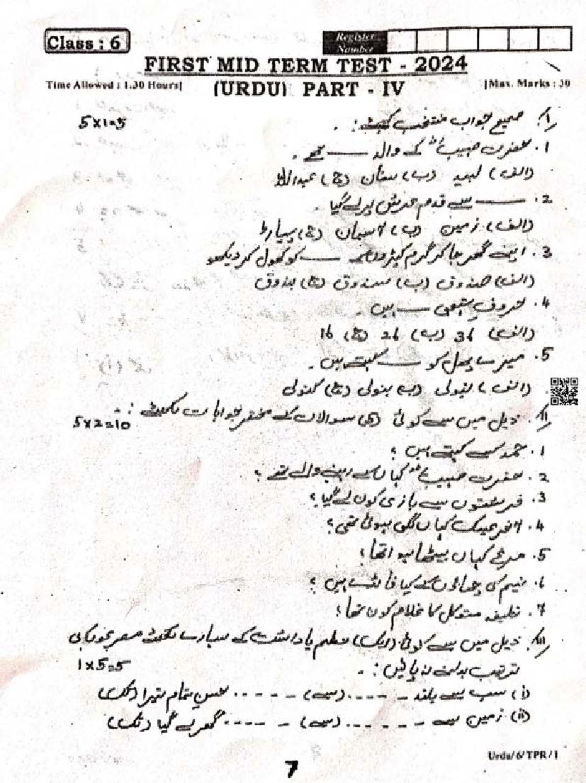 6th Standard Urdu Mid-Term Exam