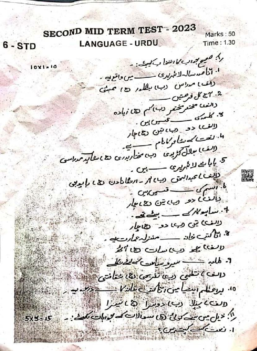 The question paper of Tamil Nadu state Second mid term examinations 2025-26 of standard 6th for Urdu subject is as follows.
