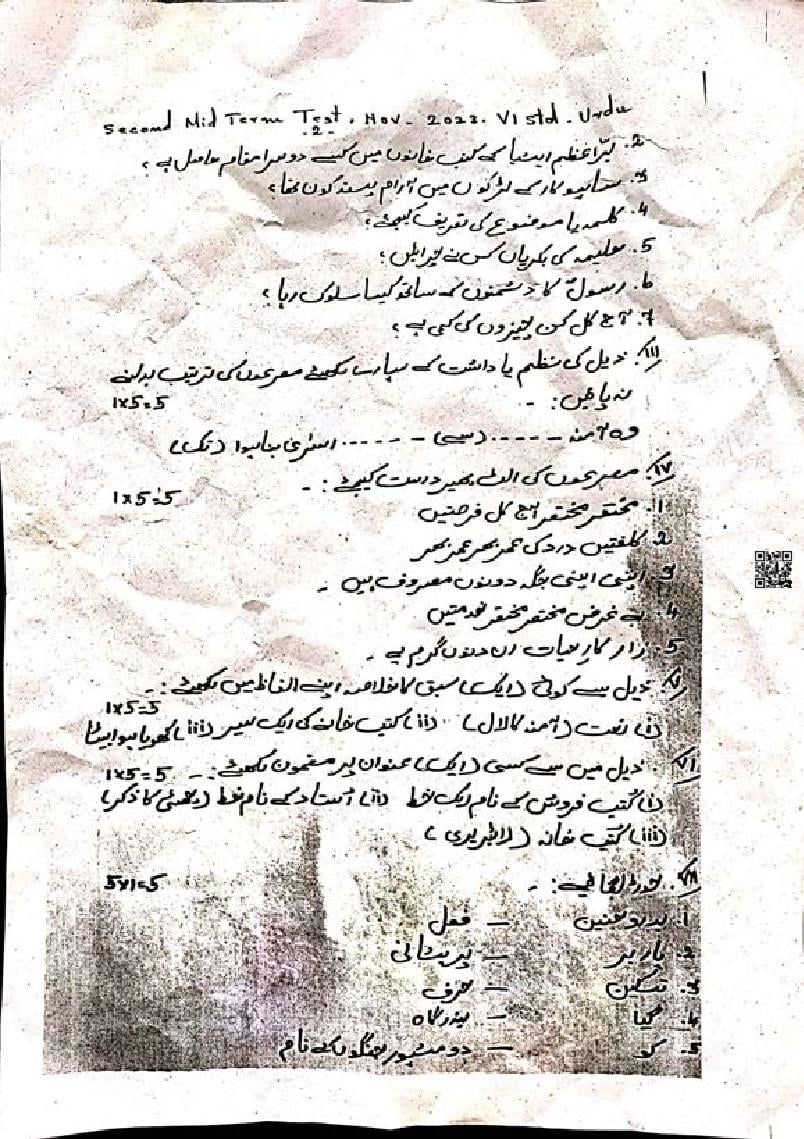 6th Standard Urdu Mid-Term Exam