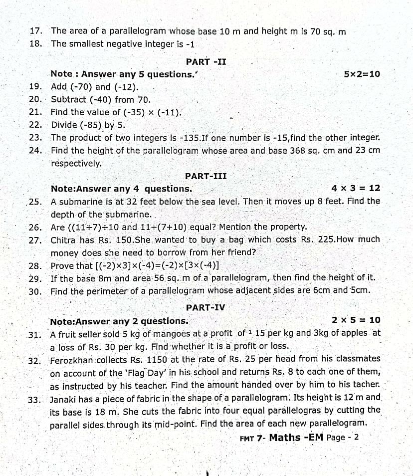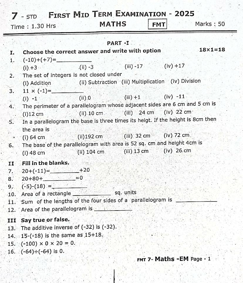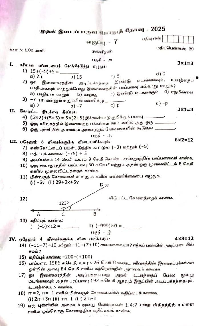 The question paper of Tamil Nadu state First mid term examinations 2025-26 of standard 7th for Maths subject is as follows.