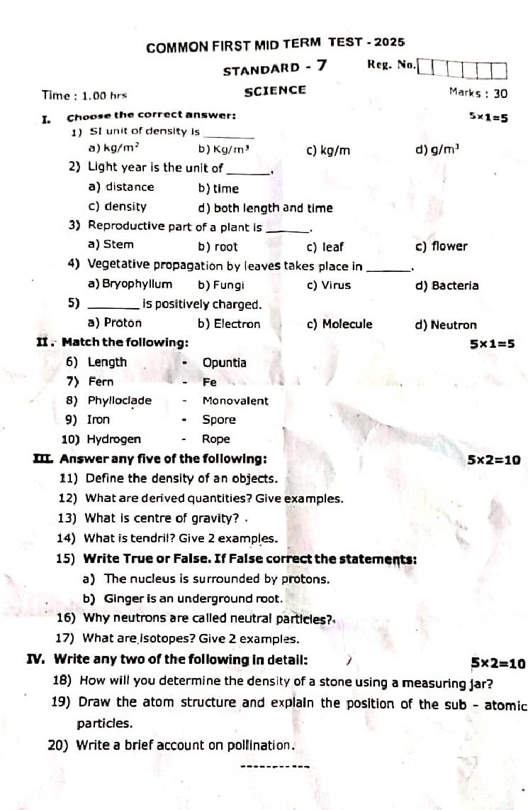 The question paper of Tamil Nadu state First mid term examinations 2025-26 of standard 7th for Science subject is as follows.