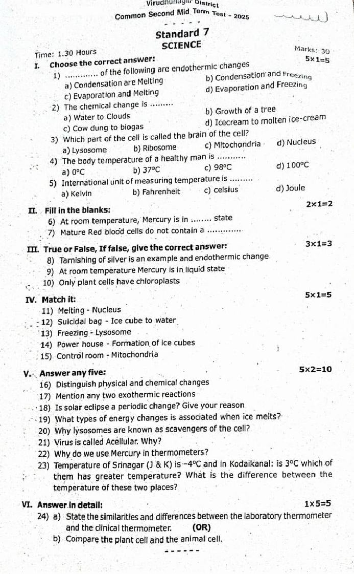 The question paper of Tamil Nadu state Second mid term examinations 2025-26 of standard 7th for Science subject is as follows.