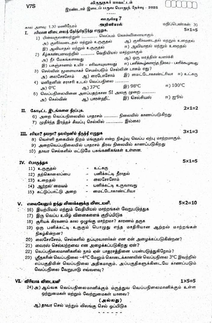 TN Class 7 Second Mid Term Question Paper 2025 Science View Download