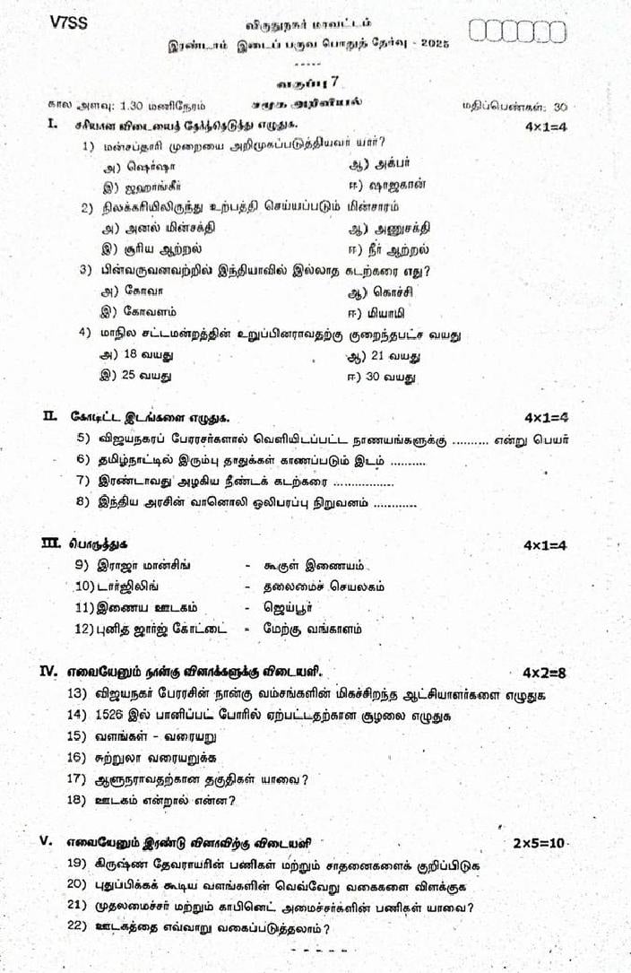 The question paper of Tamil Nadu state Second mid term examinations 2025-26 of standard 7th for Social Science subject is as follows.