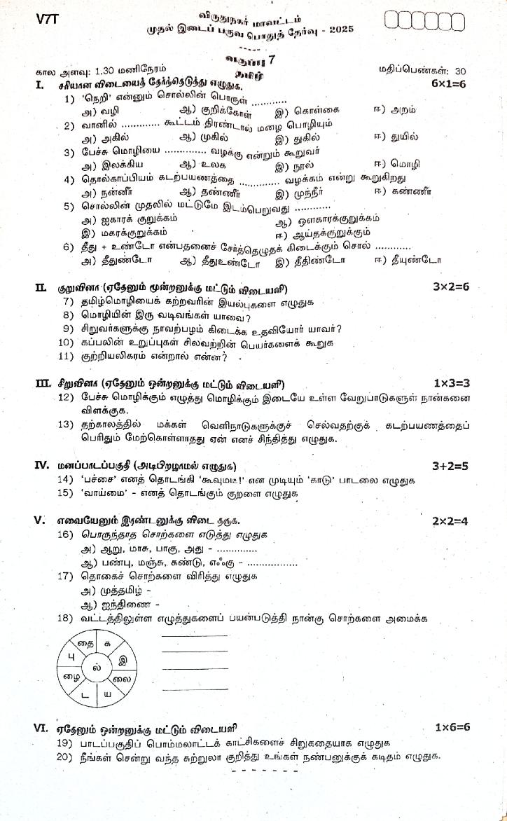 The question paper of Tamil Nadu state First mid term examinations 2025-26 of standard 7th for Tamil subject is as follows.