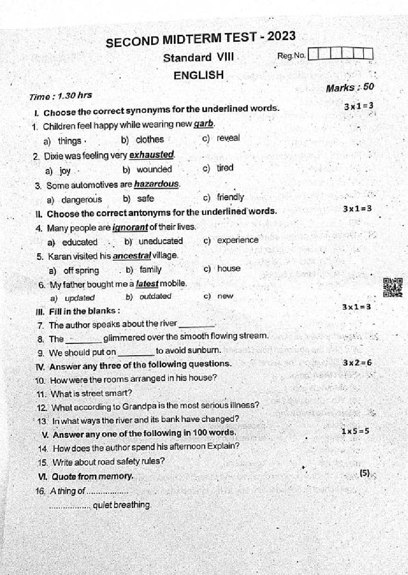 TN Class 8 Second Mid Term Question Paper 2023 English View Download