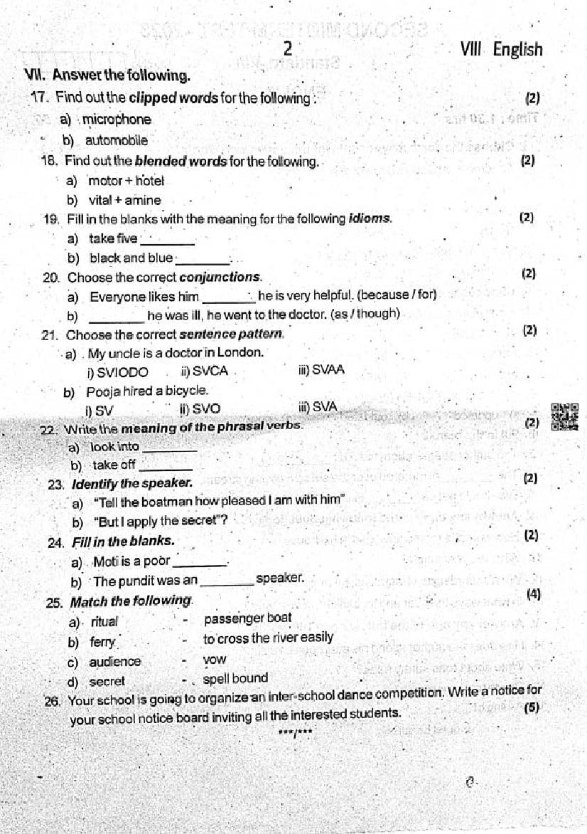 The question paper of Tamil Nadu state Second mid term examinations of standard 8th for English subject is as follows.