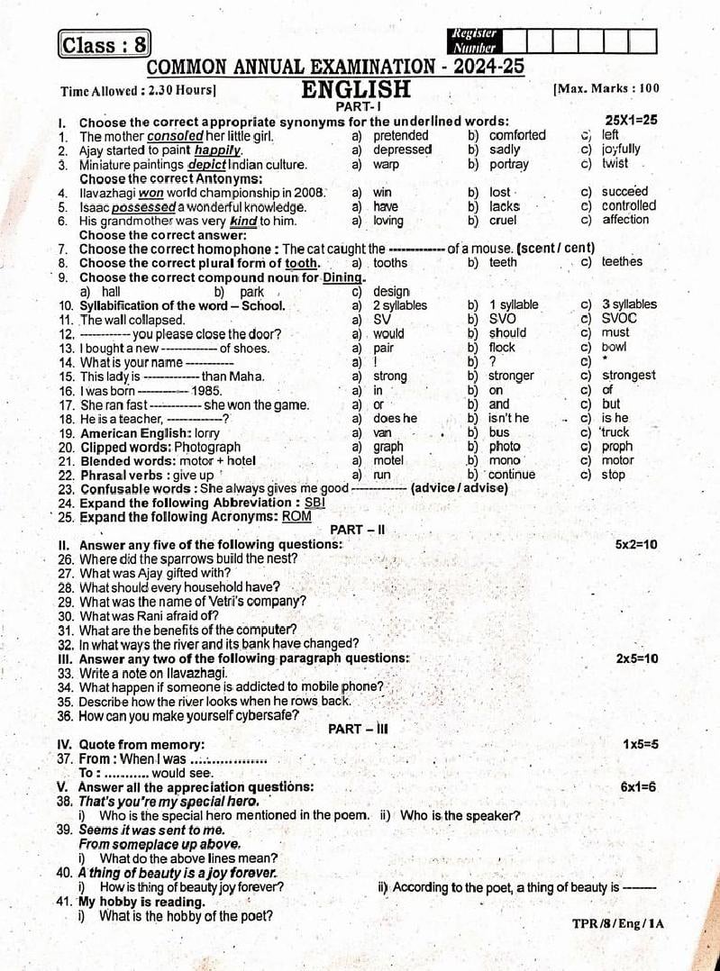TN 8th Standard English Question Paper 2025 PDF Download Link – Click Here to Download 2025 Question Paper
