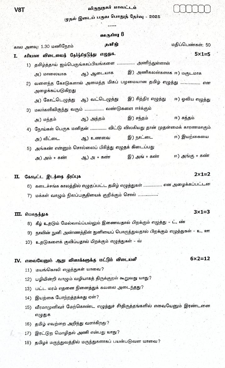 TN Class 8 First Mid Term Question Paper 2025 Tamil View Download