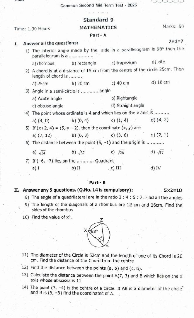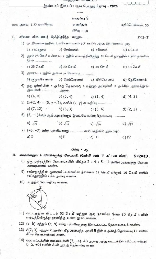 The question paper of Tamil Nadu state Second mid term examinations 2025-26 of standard 9th for Maths subject is as follows.