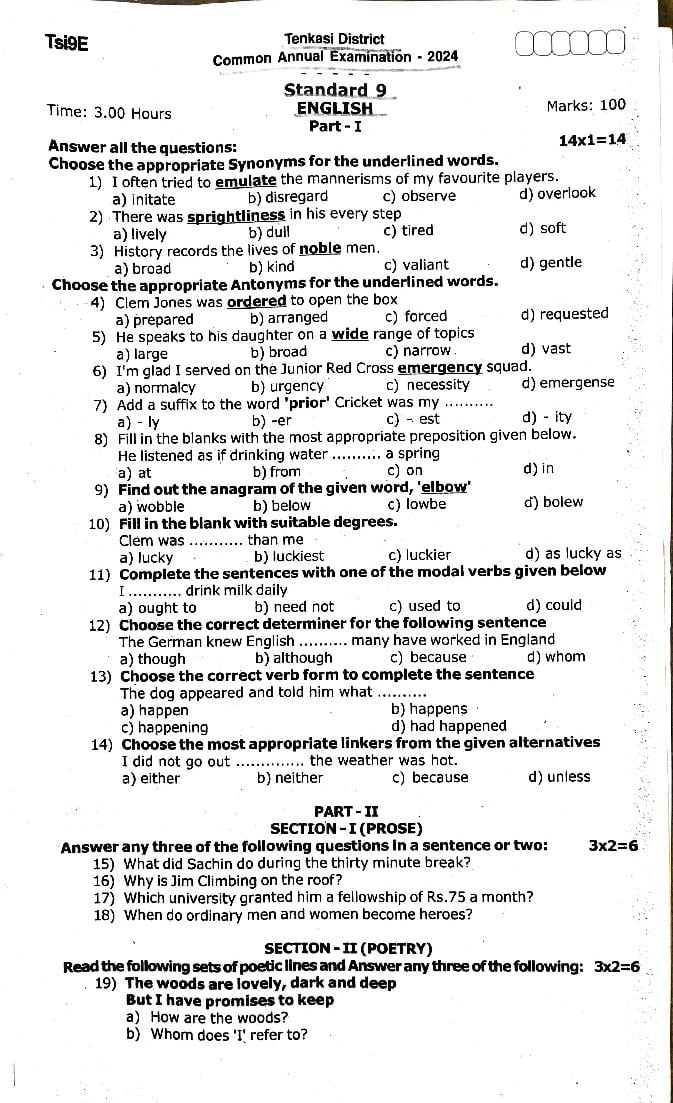 The TN Board Previous Year Question Paper for Class 9th (Class 9) English is as follows.