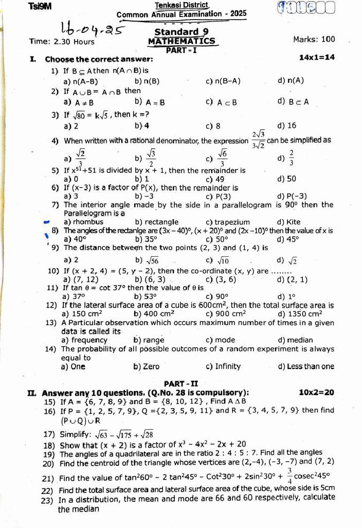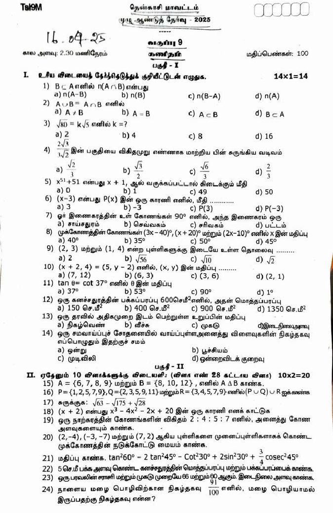 TN 9th Question Paper 2025 Mathematics View Download