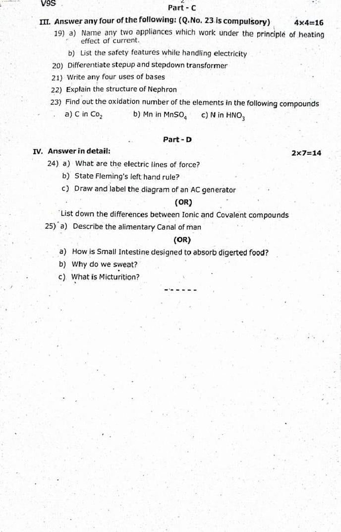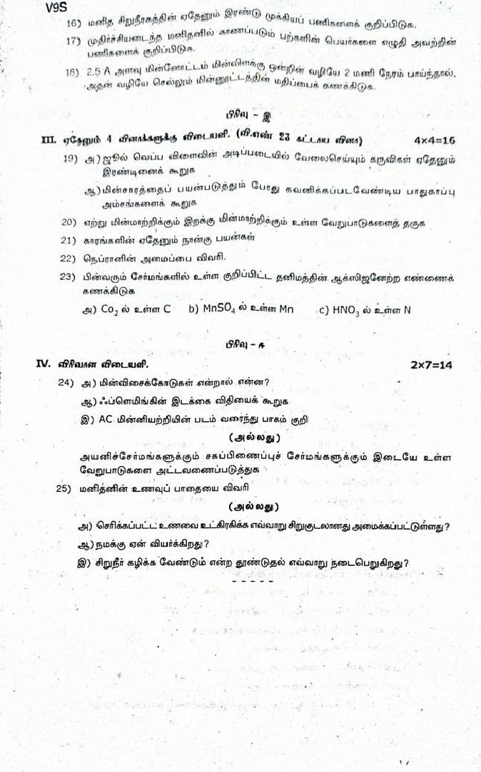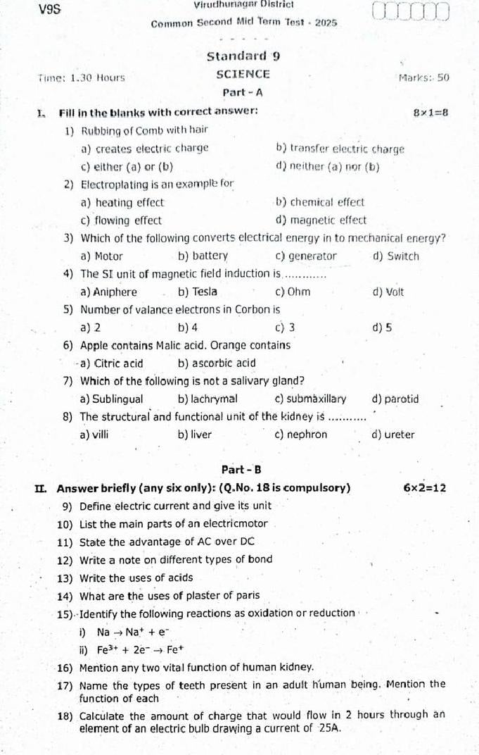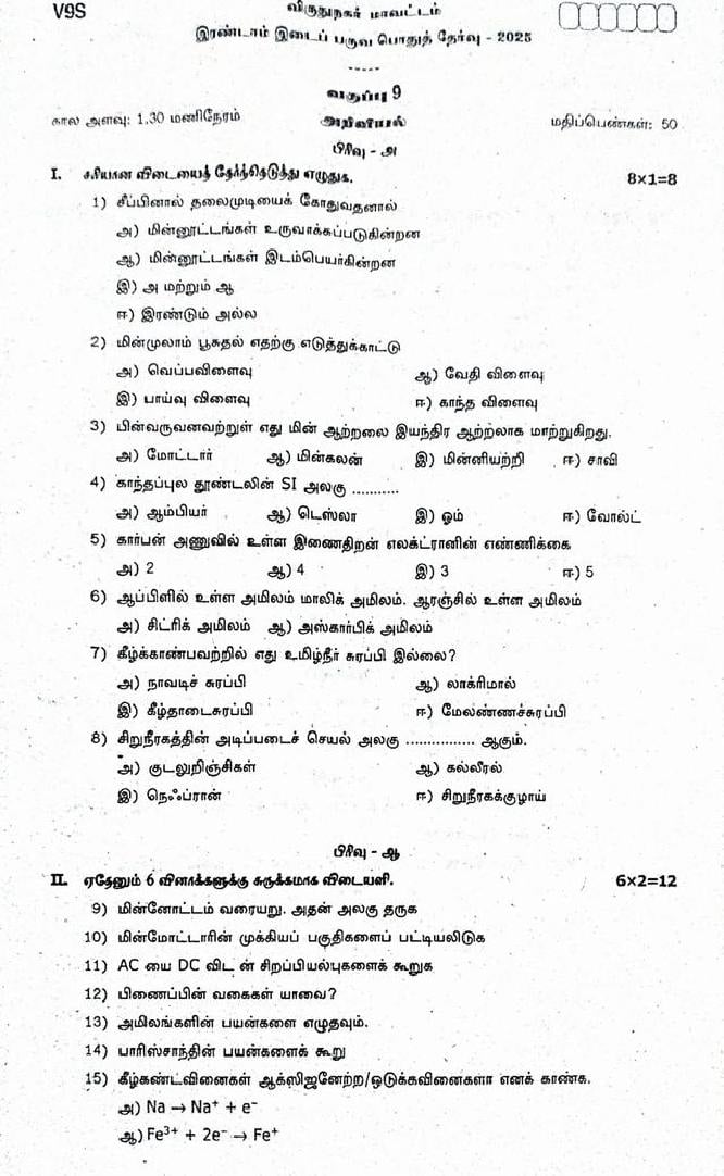 The question paper of Tamil Nadu state Second mid term examinations 2025-26 of standard 9th for Science subject is as follows.