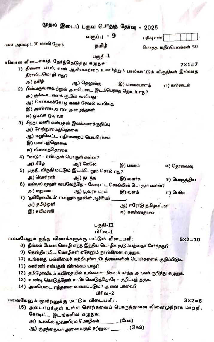 The question paper of Tamil Nadu state First mid term examinations 2025-26 of standard 9th for Tamil subject is as follows.