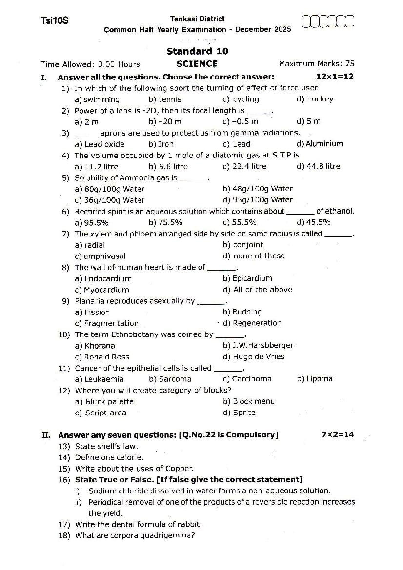 The Science question paper for Tamil Nadu board standard 10th half yearly examinations is given below.
